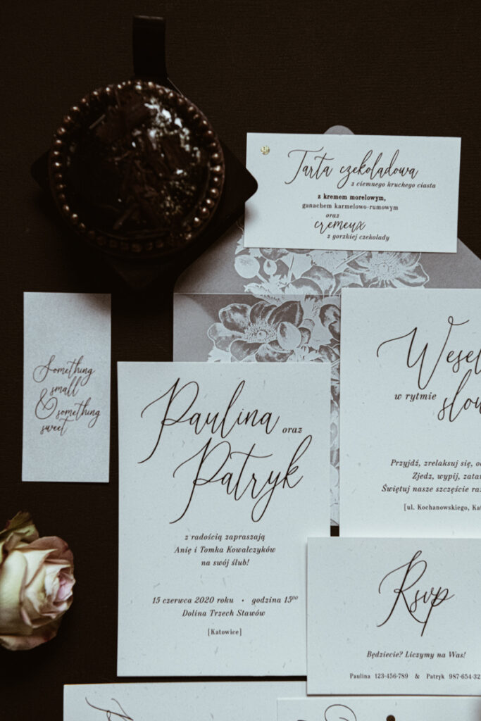 - zaproszenia tworzone całkowicie od podstaw zgodnie z wizją i pomysłem Pary Młodej